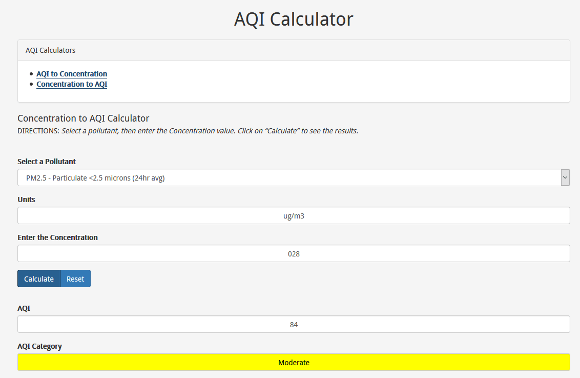 If you did everything mentioned above, when you click calculate, you should see an AQI of 84.
